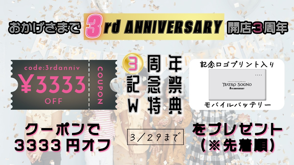 ささやかではございますが、3年間の感謝の気持ちを込めましてオリジナルのモバイルバッテリー(5000mAh)プレゼントと3,333円オフクーポンをご用意しました。