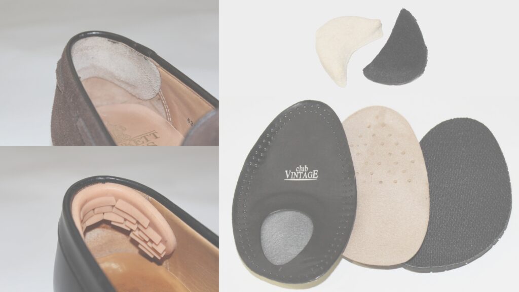 個人的なおススメは靴用グッズメーカーが販売している「ハーフインソール」と「革製かかとパッド」。単独もしくは2つを上手く組み合わせて使うことで、足当りもソフトにしつつ極端な履き心地の変化を避けた調節ができると思います。