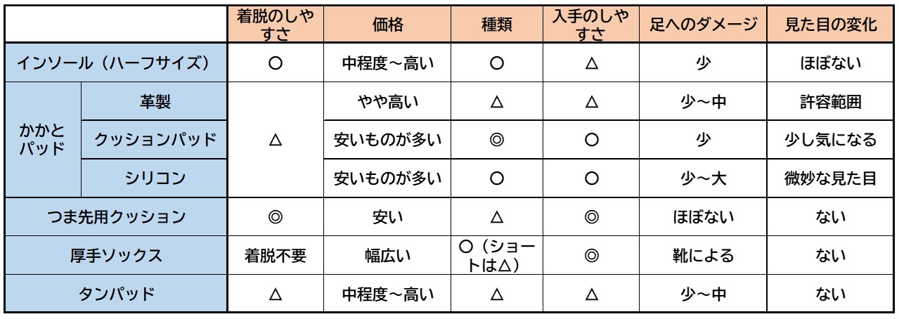 どれが良いですとは一概には言い切れないものの、値段と(ネット等で買える)種類の豊富さから行くと「クッションタイプのかかとパッド」が最も手軽で試しやすい方法だと思います。ただ粘着テープで固定した後にパッドをはがすと粘着跡が残ってしまい、靴にダメージを与える場合もありますのでくれぐれもお気を付けください。