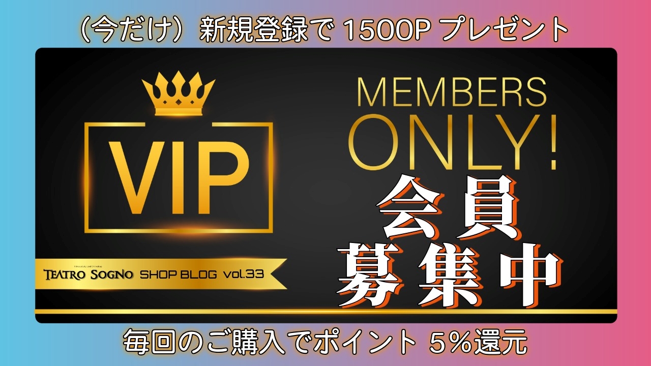 会員登録時にメールマガジンの送信を『許可』に設定されている会員様にはメールマガジン(年数回)の送信を予定しております(昨年末より配信開始)。メール送信者は「TeatroSogno メールマガジン」、送信元は当店メールアドレス(contact@teatrosogno.shop)になります。新着商品やセールの情報は勿論『メール送信許可』会員様のみのお得な“マル秘情報”もお送りする予定でおります。メール送信の設定は会員様のマイページからいつでも変更可能です